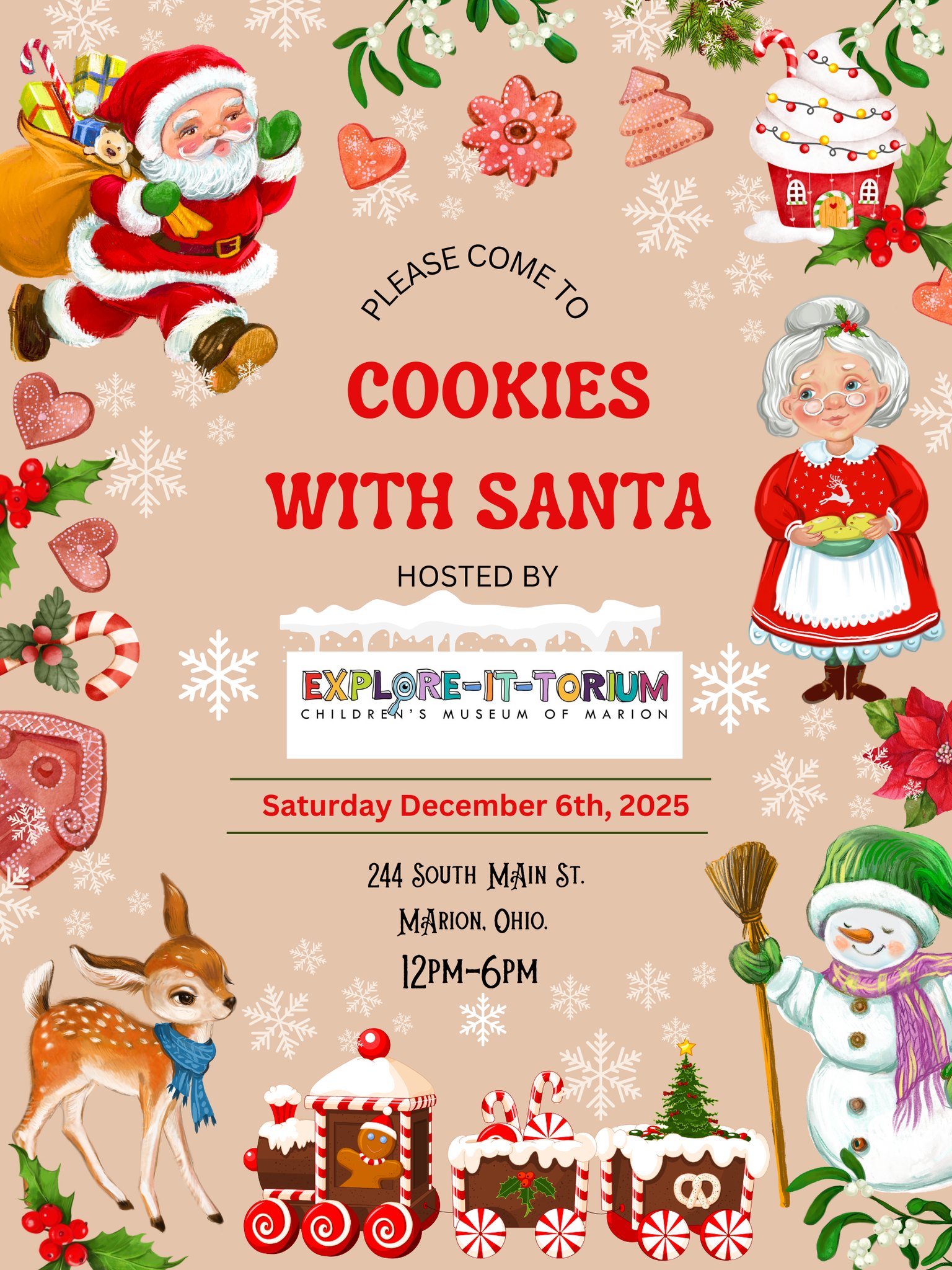 Cookies with Santa is scheduled from noon to 6 p.m. on Saturday, Dec. 6 at the children’s museum located at 244 S. Main St. in Marion. Children can tell Santa what they want for Christmas and have their photos taken with him. Families can also enjoy cookies and juice.