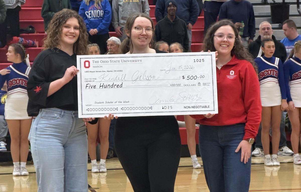 MARION, OH (MARION COUNTY NOW)—Marion Harding High School senior Kendall Gibson was named Scholar Student of the Week and awarded a $500 scholarship from The Ohio State University at Marion. The award was presented by Karlie Marlatt and Brooke Herchik, representing Ohio State Marion. This honor recognizes students who demonstrate exceptional academic achievement, leadership, and dedication to school involvement.